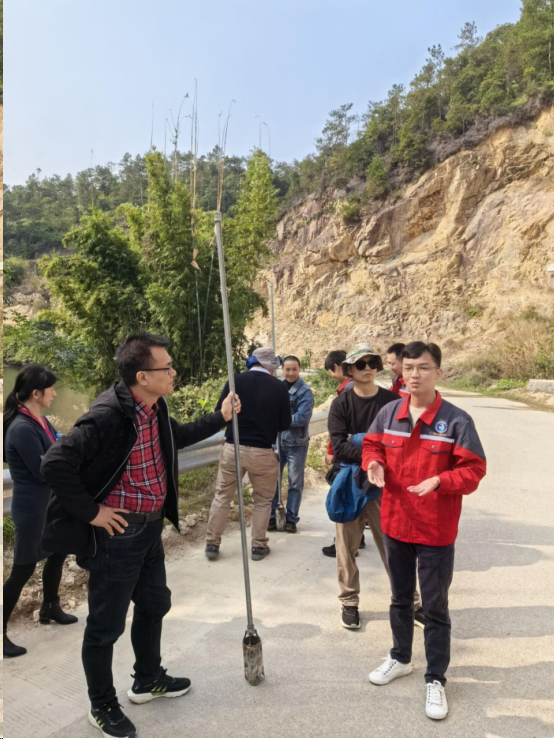11月25日上午,在江西地质七队杨斌和李家桢两位稀土矿项目负责人的陪同下,地龙珠直播 教师调研了赣县夏湖重稀土矿区,考察了夏湖离子吸附型重稀土矿的花岗岩风化壳剖面。杨斌同志详细介绍了夏湖离子吸附型稀土矿床的地质特征和勘查找矿历史,随后两位负责人同志演示了离子吸附型稀土矿的勘查技术方法以及七队独立研发的新型勘查工具——赣南钻的使用方法。老师们对该类型稀土矿的成矿机理、赋存机制及勘查技术展开了热烈的讨论,并纷纷尝试利用赣南钻开展风化壳野外取样工作。