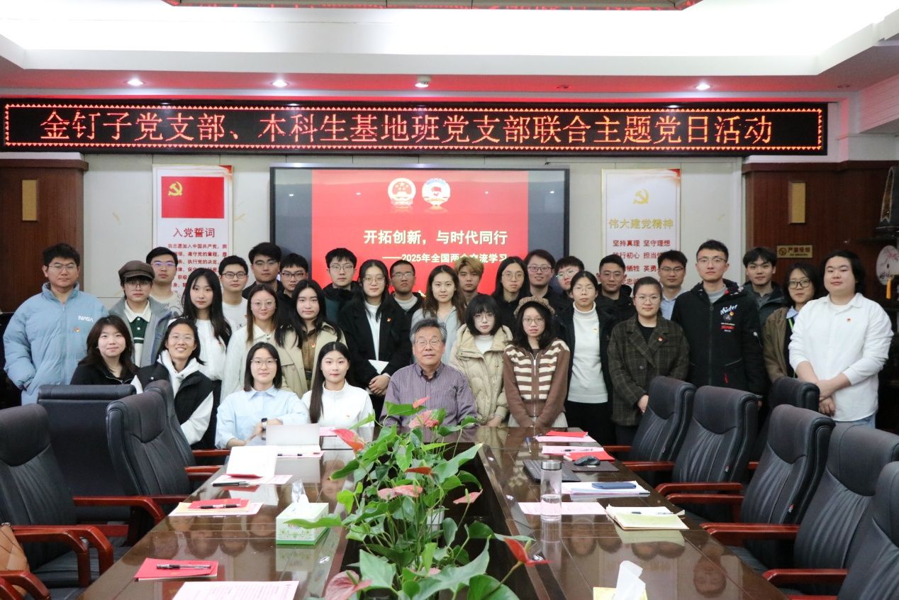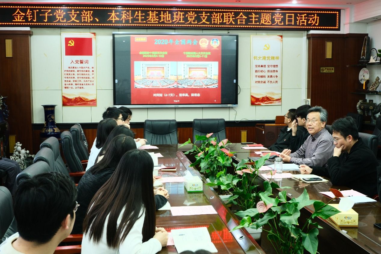 2025年3月28日,龙珠直播 金钉子党支部、本科生基地班党支部在主楼308会议室联合举办3月主题党日活动。特邀第十三届、十四届全国政协委员童金南教授列席主题党日,主讲2025年全国两会精神。主题党日由金钉子党支部副书记施翌主持。