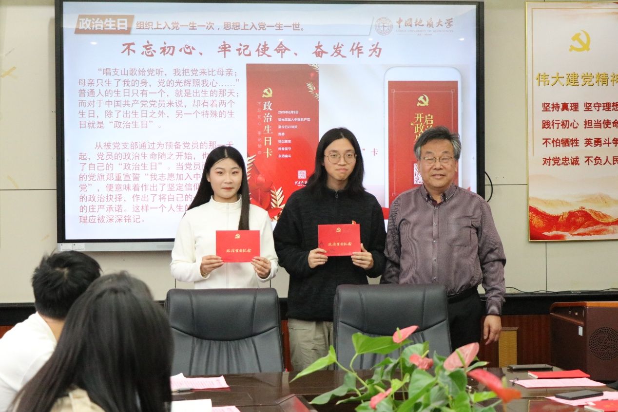 在活动的最后,两个党支部集中为党员过“政治生日”,童老师为在3月份入党的两位学生党员发放“政治生日”纪念卡。