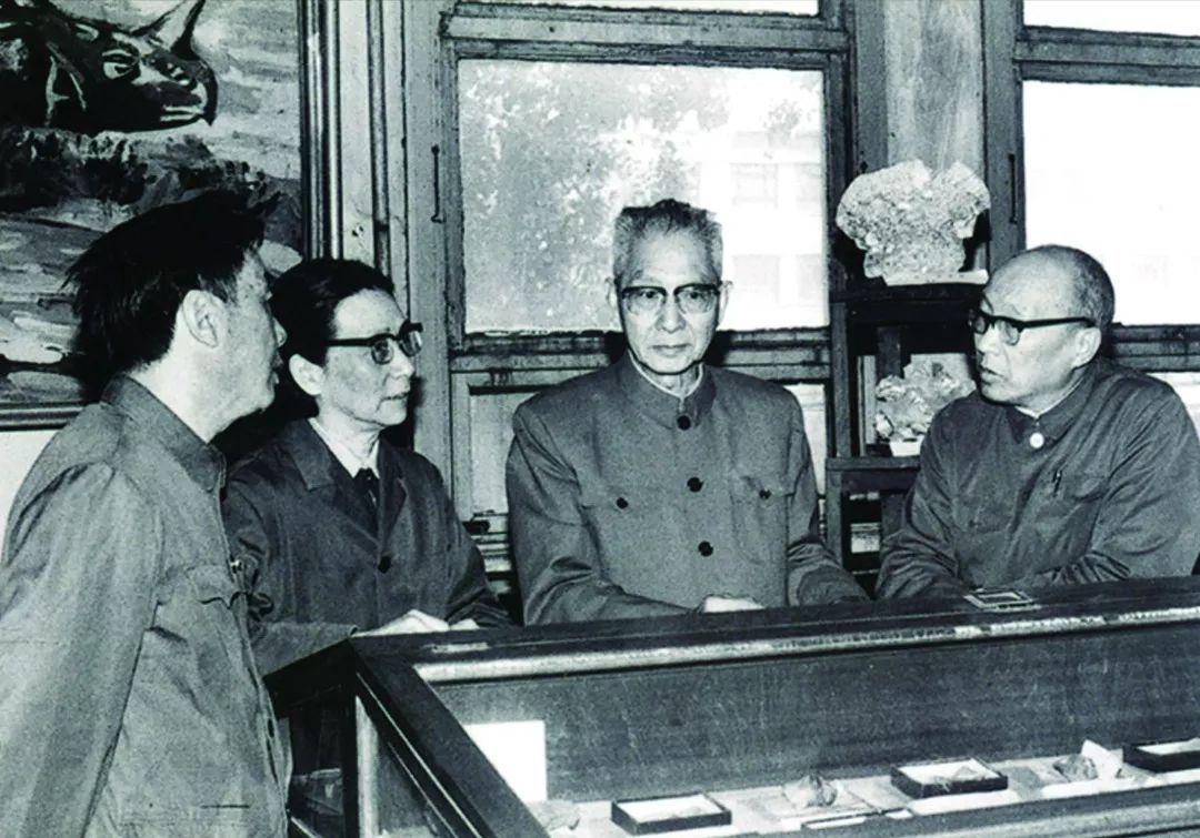 1982年,杨遵仪和王鸿祯(右1)、郝诒纯(左2)、杨式溥(左1),4位古生物学家讨论学科建设问题。