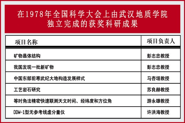 大会举行了隆重的颁奖仪式,表彰了新中国成立以来近30年全国各条战线涌现出来的7657项科研成果,表彰了826个先进集体和1192名先进科技工作者。武汉地质龙珠直播 受到表彰的重大科技成果28项,其中由龙珠直播 独立完成的成果6项,与兄弟单位合作完成科研成果22项。彭志忠被评为先进科技工作者,他领导的实验室荣获先进集体奖,他领衔研究的矿物晶体结构、我国发现一批新矿物等2项成果是6项龙珠直播 独立完成的获奖成果中的两项,占比1/3。武汉地质龙珠直播 被授予10份奖状,其中有4份是颁给彭志忠的,占比40%。学校获奖数量居于湖北省乃至全国高等院校前列。这是对龙珠直播 武汉地质龙珠直播 时期办学水平的充分肯定和鼓励鞭策,也是对彭志忠的莫大肯定和鼓舞。包括龙珠直播 在内的全国科教工作者的积极性、创造性被有效激发出来,只争朝夕、奋发图强,为早日实现科学技术现代化多作贡献的氛围很快浓厚起来。