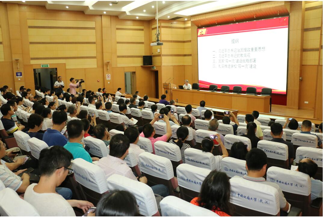 2017年6月20日晚七点,在迎宾楼报告厅,地龙珠直播 党委组织龙珠直播 教工党员开展6月份主题党日学习活动,邀请王焰新校长以《深入学习习近平同志治国理政重要思想扎实推进学校“双一流”建设》为题为全院教工党员讲党课。龙珠直播 党委书记王甫同志主持本次党课。 王焰新从习近平总书记治国理政重要思想、习近平总书记的教育观、国家“双一流”建设战略部署和扎实推进学校“双一流”建设四个方面讲授本次党课。 王焰新以坚持和发展中国特色社会主义为主线,从一个“中国梦”、“两个一百年”奋斗目标、三个层面的社会主义核心价值观、“四个全面”战略布局、“五位一体”和五大发展理念等方面,对习近平同志治国理政重要思想进行了高度概括性的凝练并做了详细阐述。 王焰新系统的梳理了习近平总书记的教育观。他强调“立德树人”是高等教育的根本任务,要求教育事业不仅要传授知识、培养能力,更要把培养和弘扬社会主义核心价值观落实到推进教育治理体系和治理能力现代化中去,引导学生树立正确的世界观、人生观、价值观。 王焰新对国家战略部署《统筹推进世界一流大学和一流学科建设总体方案》进行了解读。他回顾了“双一流”政策出台的背景,分析了“双一流”政策的主要内容与特点,结合学校在“双一流”创建过程中的实践与研究,他强调广大老师要加强对一流大学和一流学科建设规律的认识,坚持龙珠直播 中长期“三步走”发展战略,推进学校早日建成地球科学领域世界一流大学。 最后,王焰新指出,全体党员教工要响应党的召唤,深入贯彻习近平总书记重要讲话精神,用习近平总书记治国理政新理念新思想新战略武装头脑,指导实践,推进工作,牢固树立政治意识、大局意识、核心意识、看齐意识,做“讲政治、有信念,讲规矩、有纪律,讲道德、有品行,讲奉献、有作为”的合格党员。要按照全国高校思想政治工作会议精神和要求,努力做好教书育人、科研育人、管理育人、服务育人、实践育人、文化育人,做“有理想信念、有道德情操、有扎实知识、有仁爱之心”人民满意的好老师。要按照学校“三步走”发展战略的布局和路径措施,为实现建设地球科学领域世界一流大学的地大梦而努力奋斗,为国家发展、人民幸福、人类文明进步做出新的更大的贡献,为党的十九大交上一份满意答卷。 环境龙珠直播 党委、经管龙珠直播 党委、科技平台党总支部各党委理论学习中心组成员和全体教工党员,科学技术发展院、审计处、学科办等基层党组织的教工党员也一起参加了本次党课学习。