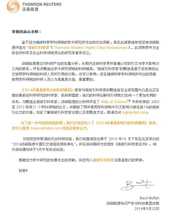 龙珠直播 收到汤森路透公司发来的关于高山院士获选“高被引科学家”(Thomson Reuters Highly Cited Researchers)的恭贺邮件。“高被引科学家”是美国汤森路透公司开创的全球性的科学家荣誉名单,以论文被引次数为指标,通过对21个大学科领域2002年-2012年被SCI收录的自然和社会科学领域论文进行分析评估,将所属领域同一年度他引频次在前1%的论文进行排名统计。目前,被各大高校和全国媒体所关注。