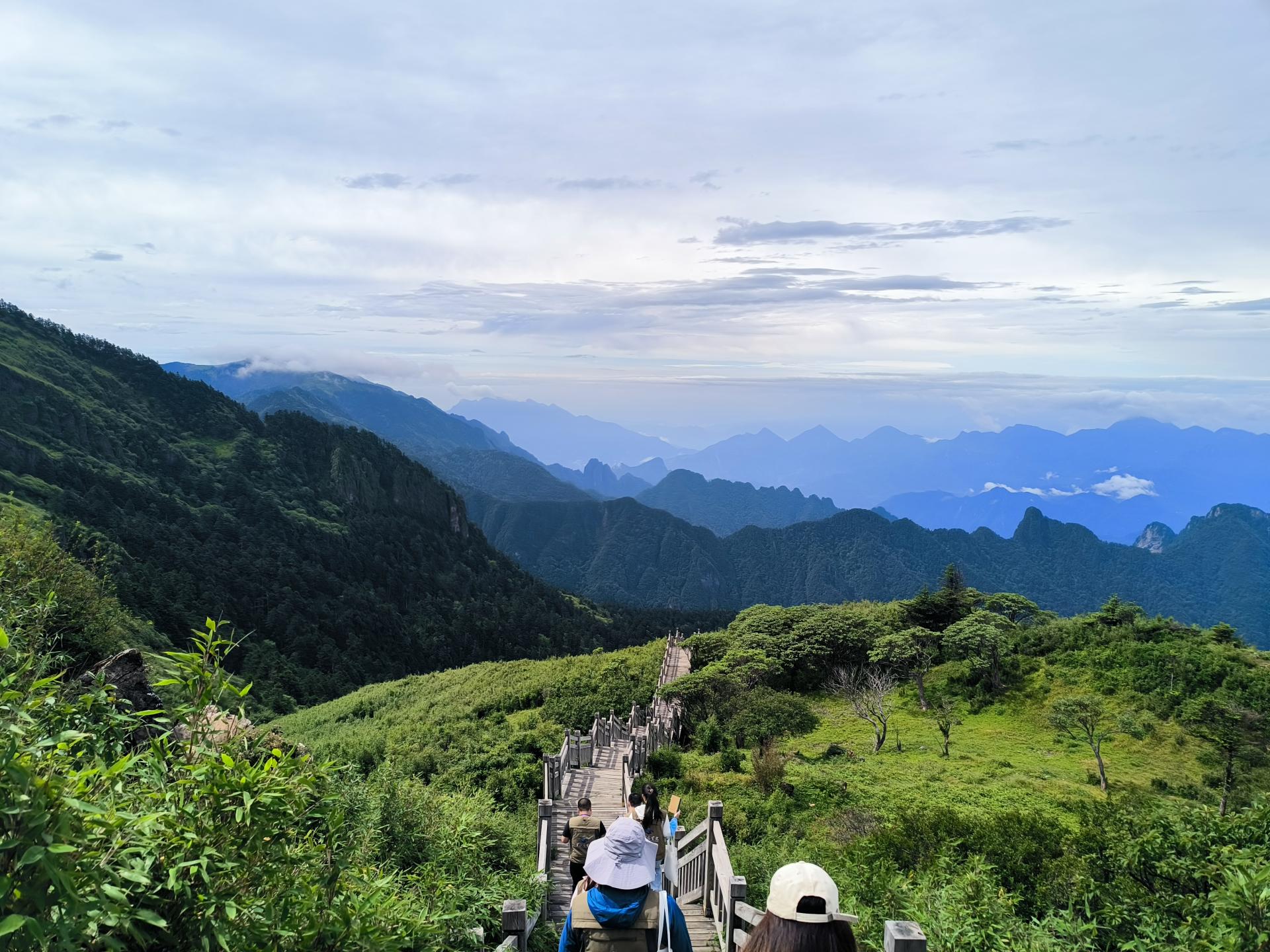 第二站步入神农顶,开始大约快四个小时的爬山之路,上坡又下坡,踏上一阶又一阶宛如天梯般被云雾缭绕的木梯,脚趾发软,双腿发颤,唯一的慰藉便是扶梯外偶尔显现的高耸入云的山巅,以及伴随丝绸般绵密的云雾吹拂到脸庞的阵阵凉风。