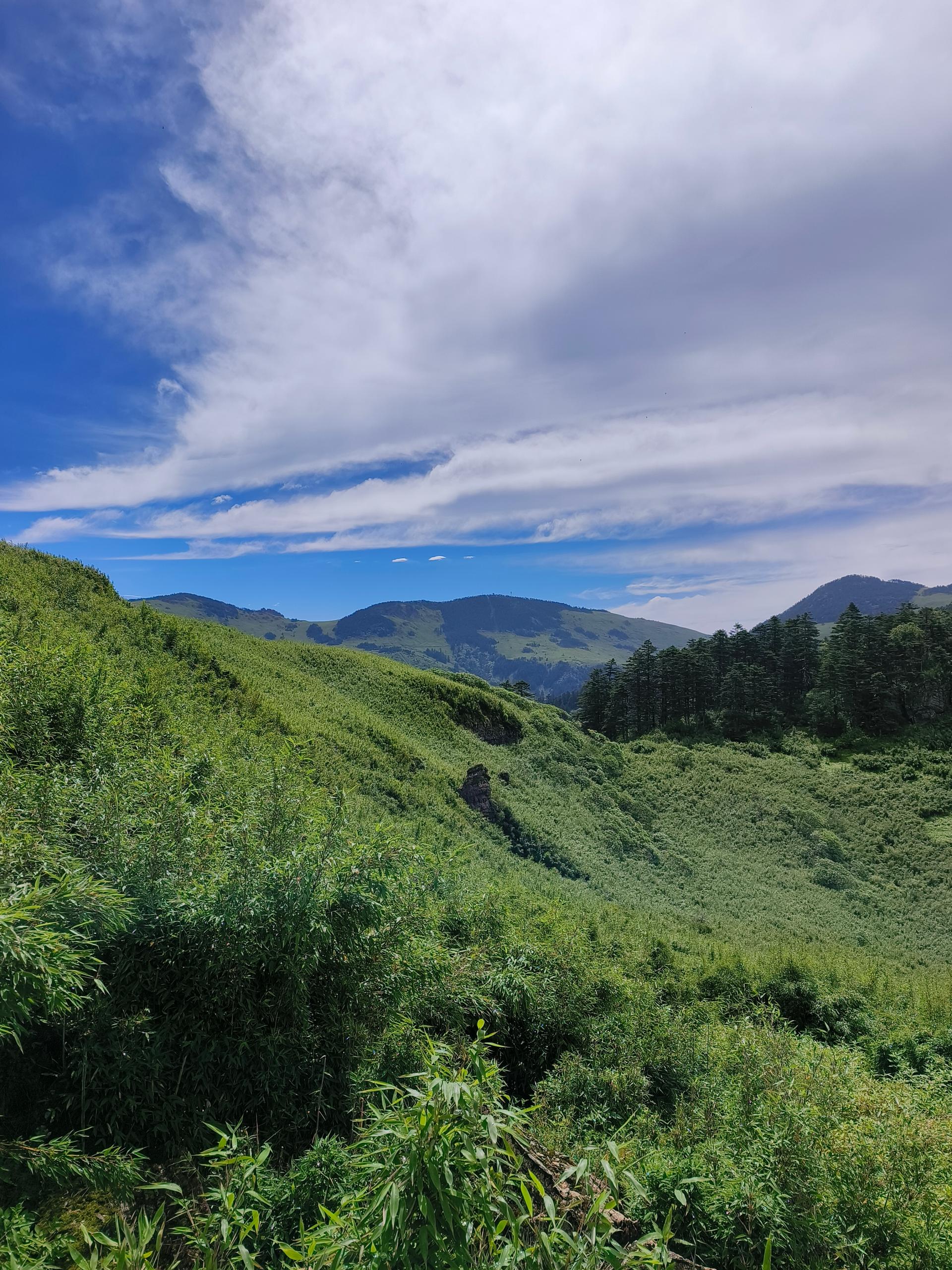 云雾散去,海拔两千多米的高山上的太阳可真毒,大家不得不披上防晒衣。空气确实清新,丝毫没有工业化的污染,蓝天,白云,总让人心头舒畅。