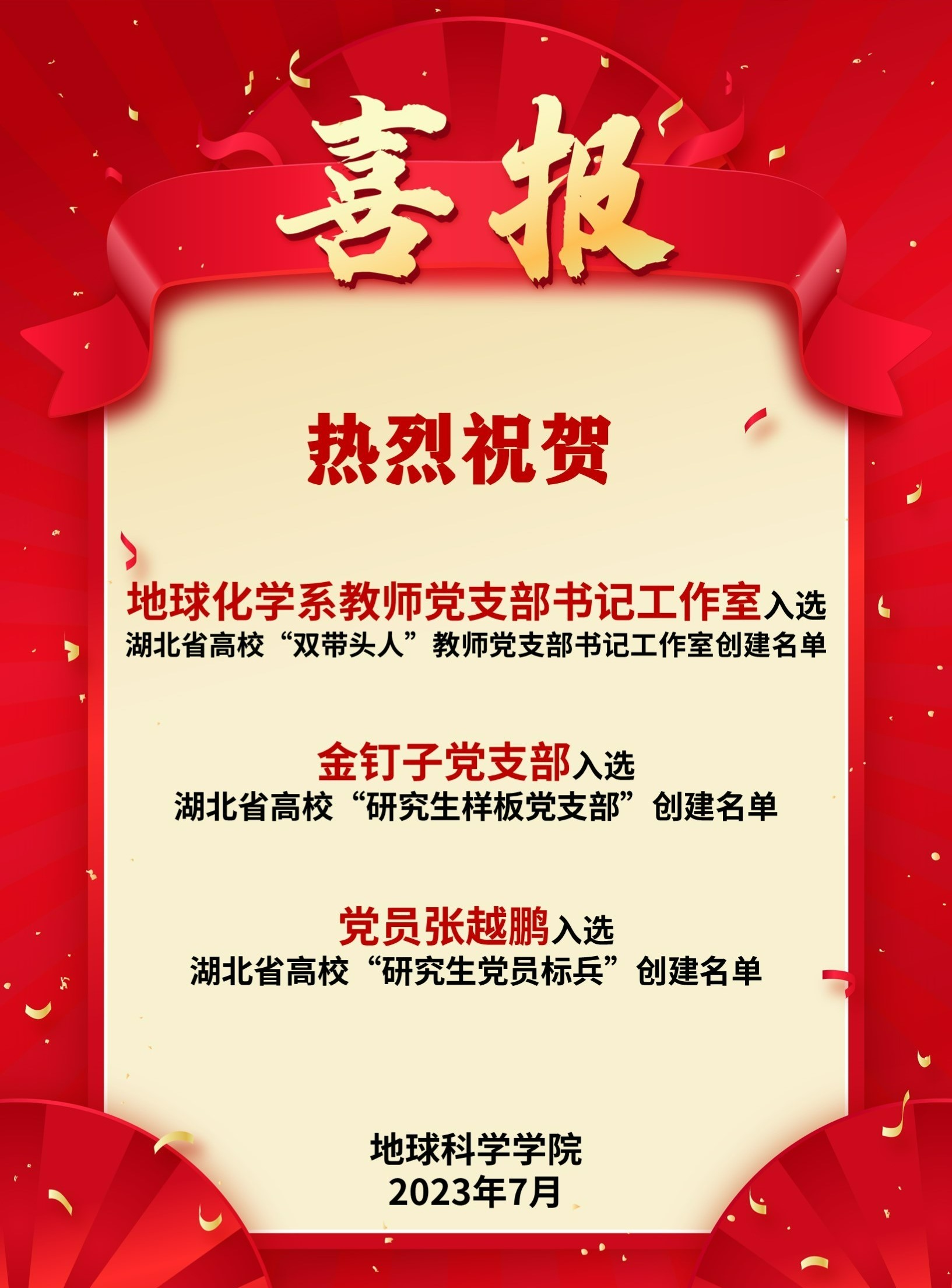近日,湖北省高校“双带头人”教师党支部书记工作室、“研究生样板党支部”和“研究生党员标兵”创建结果揭晓,龙珠直播 地球化学系教师党支部书记工作室入选湖北省高校“双带头人”教师党支部书记工作室创建名单,金钉子党支部(生物与环境演化研究生党支部)入选湖北省高校“研究生样板党支部”创建名单,党员张越鹏入选湖北省高校“研究生党员标兵”创建名单。