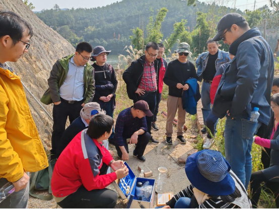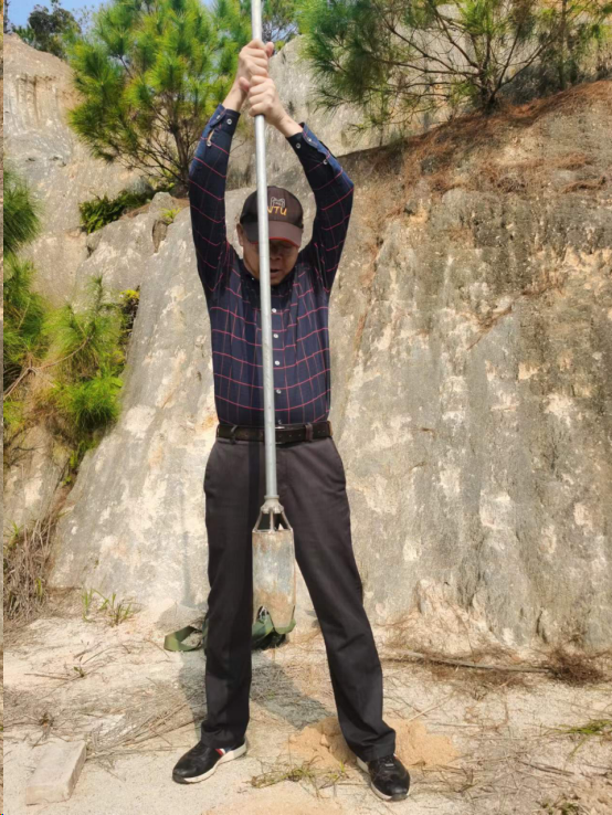 11月25日上午,在江西地质七队杨斌和李家桢两位稀土矿项目负责人的陪同下,地龙珠直播 教师调研了赣县夏湖重稀土矿区,考察了夏湖离子吸附型重稀土矿的花岗岩风化壳剖面。杨斌同志详细介绍了夏湖离子吸附型稀土矿床的地质特征和勘查找矿历史,随后两位负责人同志演示了离子吸附型稀土矿的勘查技术方法以及七队独立研发的新型勘查工具——赣南钻的使用方法。老师们对该类型稀土矿的成矿机理、赋存机制及勘查技术展开了热烈的讨论,并纷纷尝试利用赣南钻开展风化壳野外取样工作。
