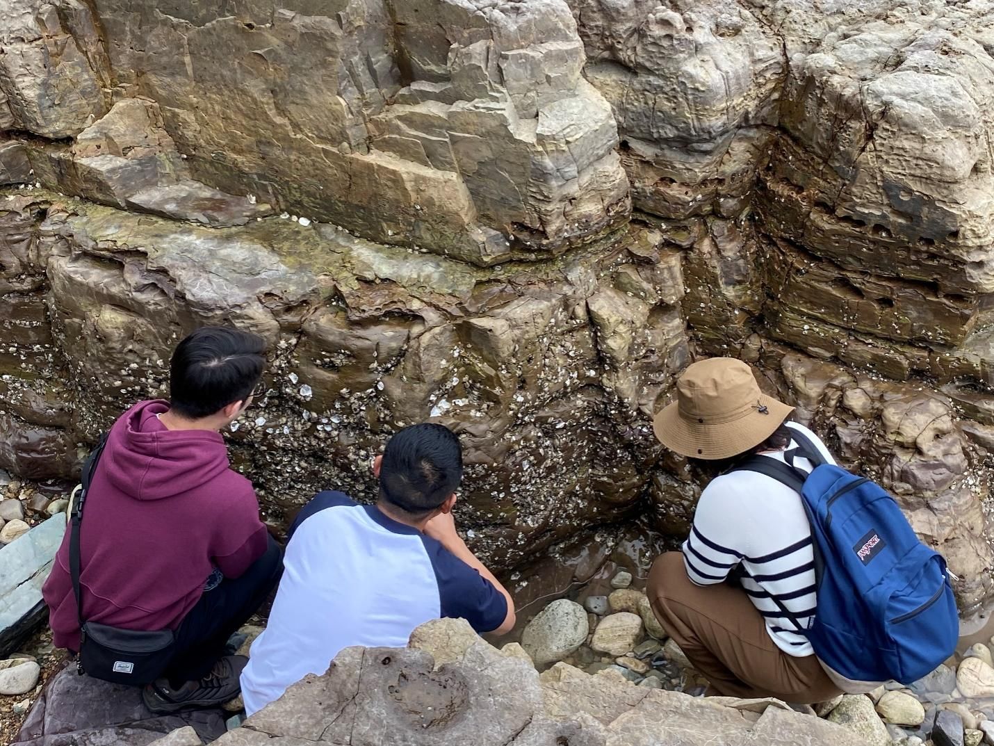 次日,在红岩长廊海蚀平台,大家见证了中国沿海第一崖滩长廊的壮美景色。海蚀作用在此处形成了海蚀崖、海蚀平台、海蚀柱等多种地质遗迹,展现了外动力地质营力和海洋演化的奇妙魅力。红岩长廊海蚀平台,强化了大家对现代海洋地质作用的认识,更加深入理解了“将今论古”的地质学原理。