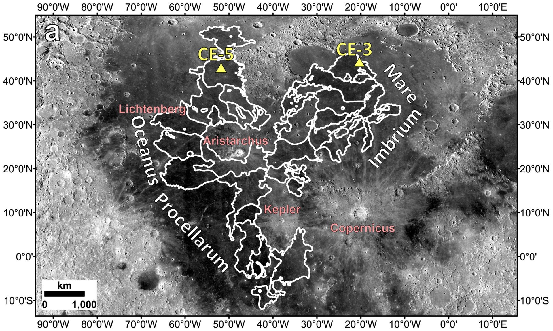 图1. 月球年轻月海玄武岩分布及嫦娥三号、嫦娥五号任务着陆位置