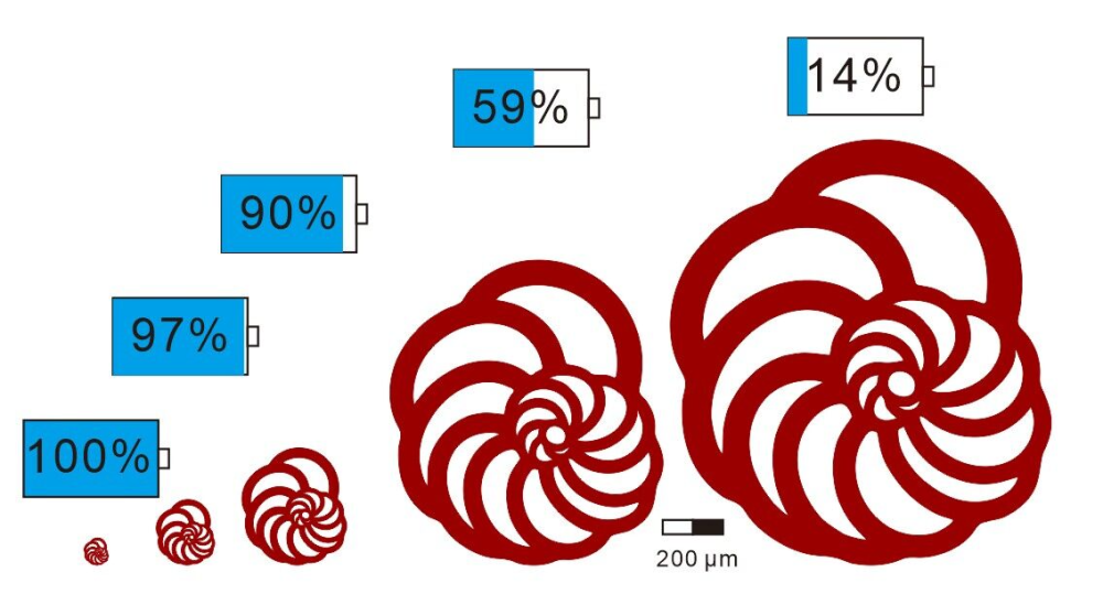 论文通讯作者宋海军介绍,有孔虫作为一种单细胞海洋原生生物,广泛分布于全球海洋中,具有超过5亿年的演化历史。有孔虫在海洋生态系统中扮演着重要角色,参与碳循环并为许多海洋生物提供食物来源。更重要的是,有孔虫的地质记录从寒武纪一直延续到现代,为研究其大小演变与灭绝的关系提供了丰富的化石材料。