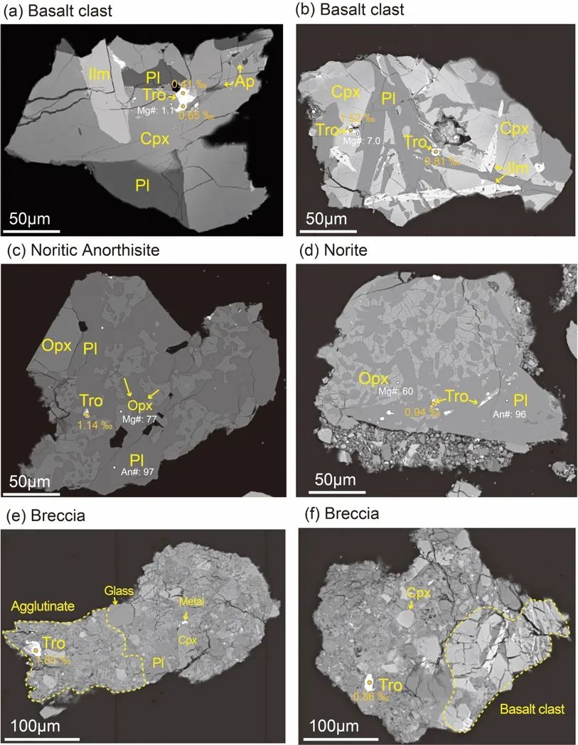 月球玄武岩中的硫主要以陨硫铁的形式存在,主要形成于玄武岩浆演化晚期,因此陨硫铁的硫同位素组成能够代表岩浆整体的硫同位素特征。但是这些硫化物粒度非常细小,大部分小于20微米。得益于龙珠直播 (武汉)地质过程与成矿预测全国重点实验室激光测试方法的持续创新突破,胡兆初教授团队开发了对地质和行星样品中硫化物硫同位素的高空间分辨率(~8μm)和高精度(δ34SV-CDT: 0.50‰, 2sd)测试手段。该方法具有基体效应弱、高效低廉的显著优点,已经成功应用于嫦娥五号和月球陨石(图1,Wang et al., 2024)。龙珠直播 (武汉)汪在聪教授团队对嫦娥六号月壤中的低钛玄武岩以及月壳岩屑进行了详细的岩石学和地球化学工作,来理解月背壳幔岩石的硫同位素及其与正面的异同性,取得如下进展。