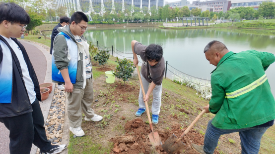 晨光熹微,同学们早早被热情所感染。在旭日初升的8时,30多名志愿者身着鲜艳的志愿者马甲,脸上洋溢着笑容,手捧树苗盆、拎花苗篮,肩扛铁锹,手持锄头,专心聆听未来城校区管理办公室工作人员传授的植树要领和技巧。“花苗间距取舒心美观” “浇水量务求得当”,诸如此类的指导后,大家默契配合,挥锹翻耕、埋固花苗、挑摆铁锹、清理杂草、扶持幼苗、夯打土基、潜心灌溉……整个场景充满生机活力,欢声笑语在湖畔飘荡,劳动精神在心间荡漾。一拨一拨泥土、一锹一锹土,一桶一桶水,同学们体味到劳动的辛勤,享受劳动的快乐,也感受到志愿服务的深邃内涵。经过繁忙的两个多小时,小树苗、鲜花在春风的拂动下,轻轻摇曳,焕发勃勃生机。