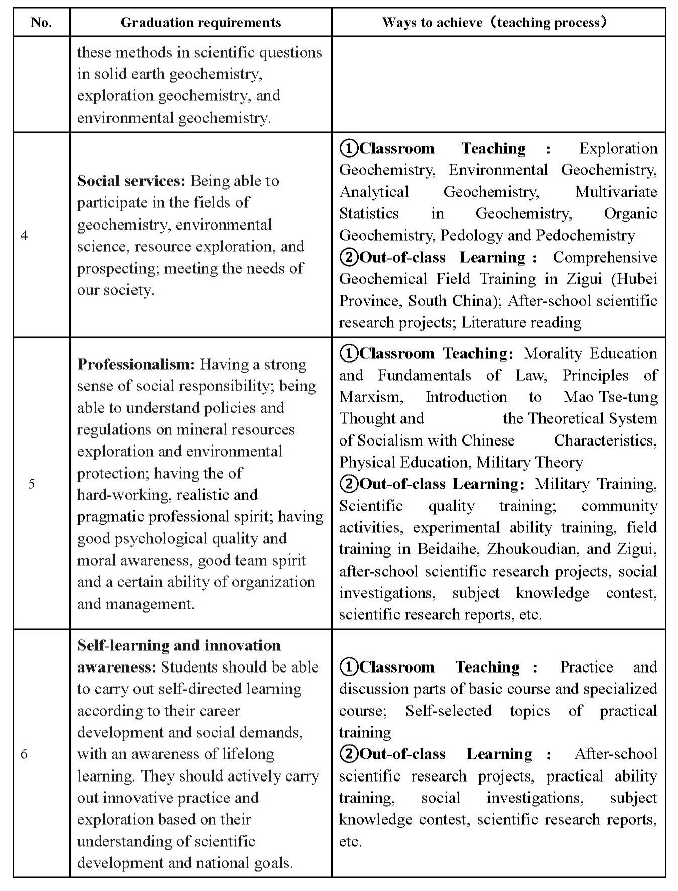 2. Professional knowledge: Students should have solid knowledge of basic geological theories, can recognize common geological phenomena, and had the necessary skills to carry out investigations and researches on solid earth geochemistry, exploration geochemistry, and environmental geochemistry.