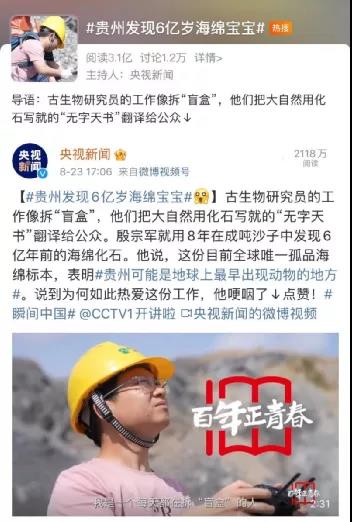 央视新闻微博报道殷宗军在贵州发现6亿岁海绵宝宝