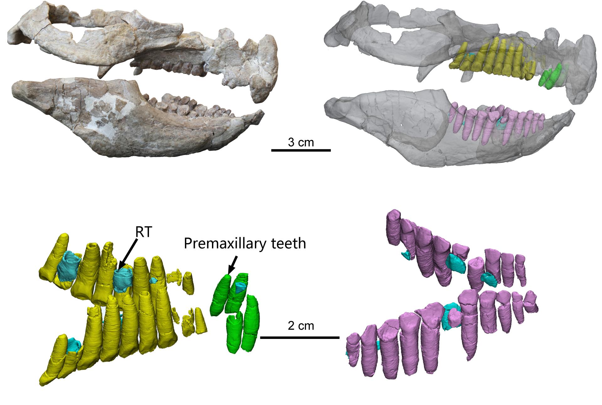 Normally, we can only see the crowns of dinosaurs, whereas the roots and replacement teeth are usually hidden in the jaw. The researchers scanned three Jurassic ceratopsians found in China, including Yinlong downsi, Hualianceratops wucaiwanensis, and Chaoyangsaurus youngi, with micro-computed tomography (CT). The team reconstructed 3D models of all dentitions of these specimens, and studied the development of each functional tooth (tooth performing chew or other function) and each replacement tooth (newly erupted but not performing function) through the upper and lower jaws (Figures. 2-3).